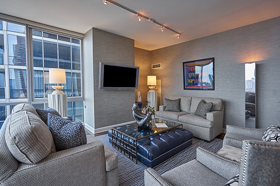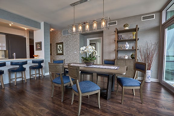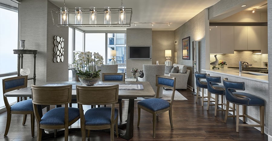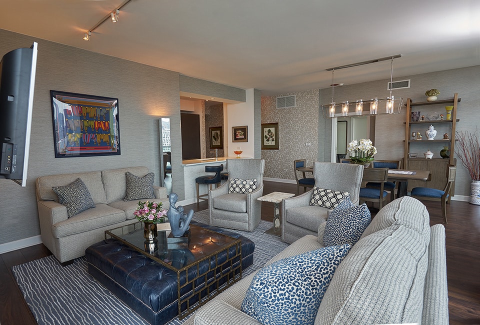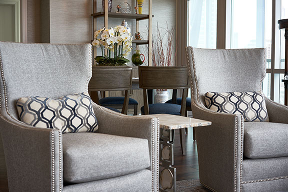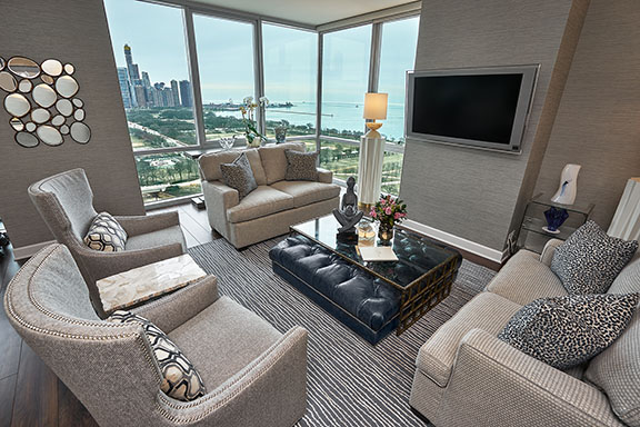 Almost twenty years ago we created distinctive interiors for a very energetic couple from Barrington. Time passed, children gone, their dream was to live in the city where everything was walking distance. They liked to entertain intimate gatherings. It had to have a view of Lake Michigan and did not want a lot of upkeep, so pared down square footage was a must. Last they wanted interiors that are updated, no more stuffy, tired traditional style. Now they love their carefree, refreshing interiors that promote style and youthful exuberance.