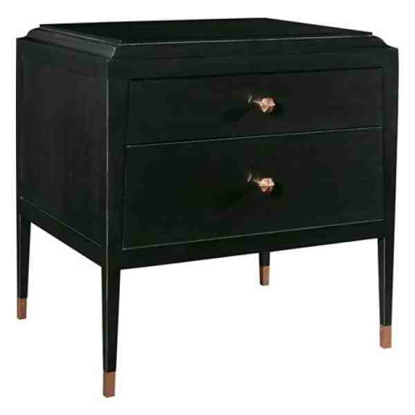The Andrew side table features a sleek, tapered profile terminating with Golden Brass ferrules, two drawers with understated Golden Brass pulls and a slip matched beeswing primavera top. This elegant side table is finished on all four sides. Golden Brass hardware standard. Andrew Silver hardware also available. Oxford is the standard finish. Optional finishes available as 5468-70. Optional Kohl finish shown. A companion Andrew Cocktail Table and Andrew Console Table are also available.