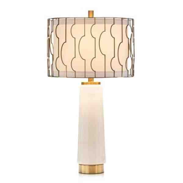 28.5″H A table lamp with a white ceramic body and an antique brass shade encasing another shade. Shade: 15″ X 15″ X 10″, Off White outside and White inside, Man-Made Linen and Man-Made Silk, Round. 3 Way, 150 Watt Max, Type A Bulb, 9.5″ Gold Harp