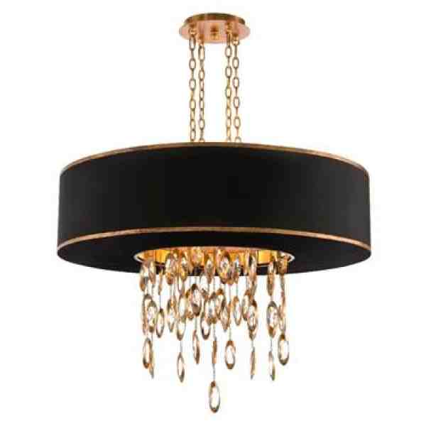 This pendant chandelier has a tailored, rich black shade with gold trim. The faceted crystals are suspended in metal settings cut on the bias. Shade: 36″ X 36″ X 9″, Black with Gold Trim, Man-Made Silk. Medium Base, 60 Watt Max.