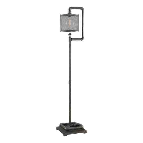 64H, Shade 9H X 10 Dia. Industrial inspired using old iron pipes, finished in a rust bronze with a patina gray wash, holding a matching iron mesh shade, accented with an aged, solid pine foot. 60 watt, antique style, G125 round bulb included.