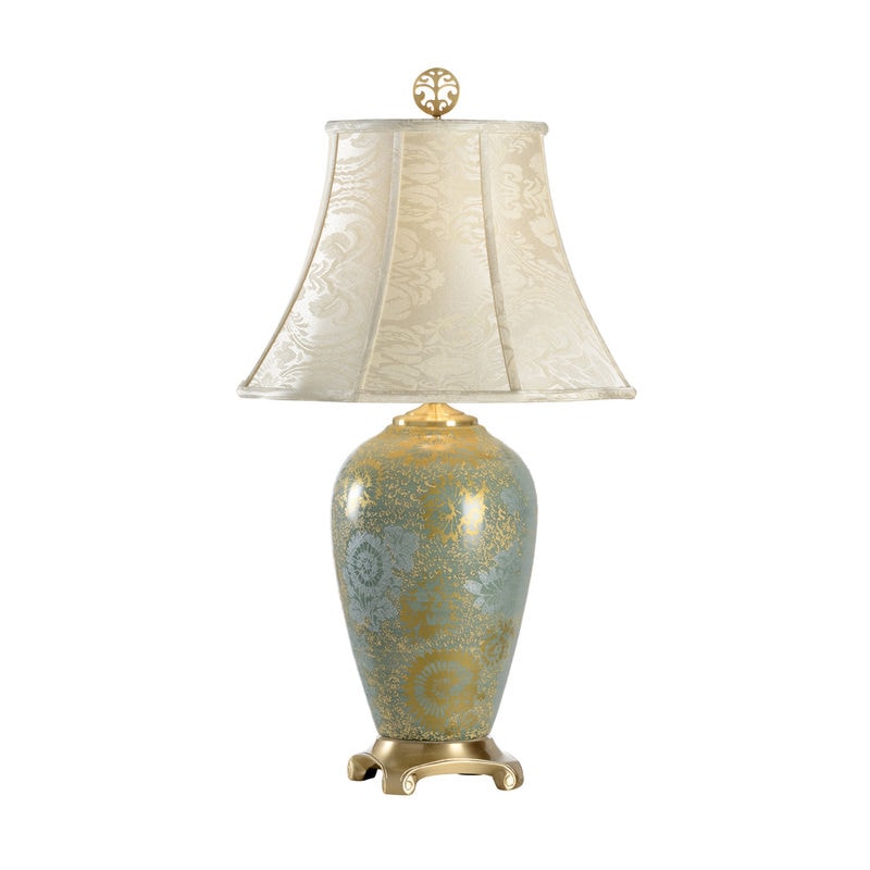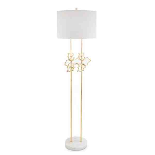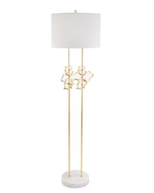 This floor lamp features amorphous acrylic discs edged in gold leaf floating above a marble base. Shade: 18″ X 18″ X 12″, White outside and inside, Man-Made Linen and Cotton, Round. 3 Way, 150 Watt Max, Type A Bulb, 10″ Brass Harp, Turnkey