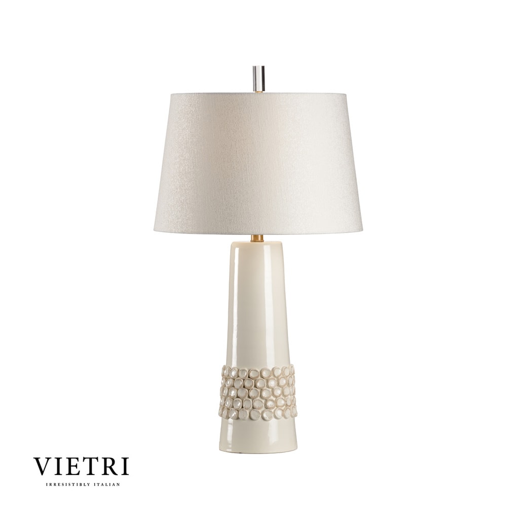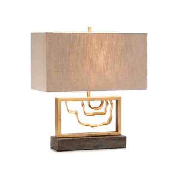 22″H A table lamp featuring three layers of gold-leaf within acrylic, framed in steel, on a concrete base. Shade: (19″ X 9″) X (19″ X 9″) X 10″, Oat outside and White inside, Cotton and Man-Made Silk, Rectangular. 3 Way, 150 Watt Max, Type A Bulb.