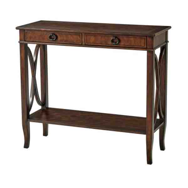 A cerejeira veneered and mahogany console table, the rectangular crossbanded and moulded edge top above two frieze drawers, on square legs joined to the sides by wavy ‘X’ stretchers and on splayed legs, joined by a crossbanded undertier. Inspired by a 20th century French original.