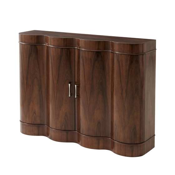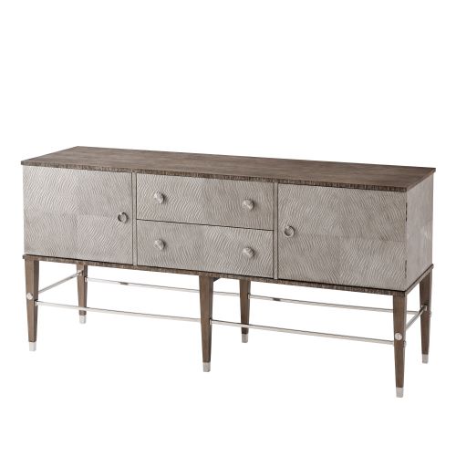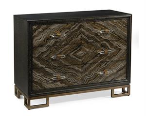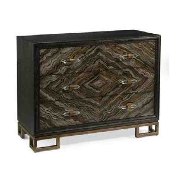 A three-drawer oak chest in black with gold cerusing. The drawer fronts are a hand-painted faux marble pattern of taupes and gold, furnished with brass and crystal prism-shaped handles. The case is set on a steel base.