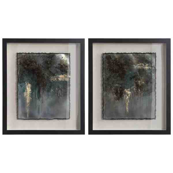 Hand painted on metal sheets, this contemporary artwork features shades of silver and gold leaf, dark brown, and green. Each piece is placed under protective glass in a black shadow box style frame against a beige background. Due to the handcrafted nature of this artwork, each piece may have subtle differences.