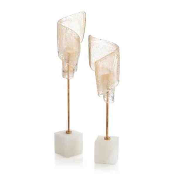 A pair of magnificent glass curls with a hint of gold are suspended high above white alabaster bases.
