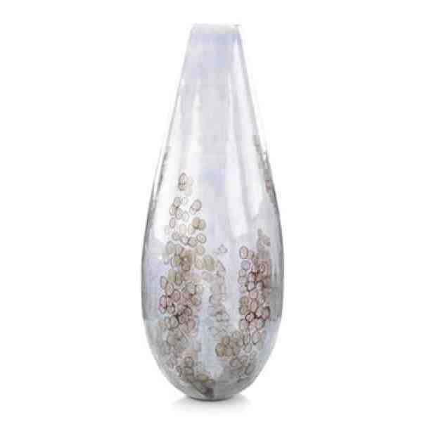 This tall vase is truly captivating with the crackled effect of this sky-gray transparent glass with warm bronze tones of floating air bubbles of various sizes trapped inside the vase.