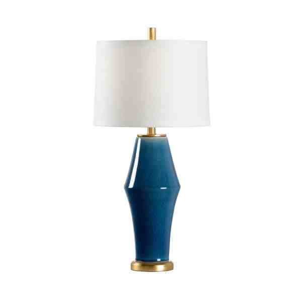 Gray blue crackle glazed ceramic with antique gold leaf wood cap and base and with antique brass parts