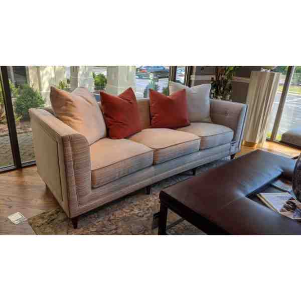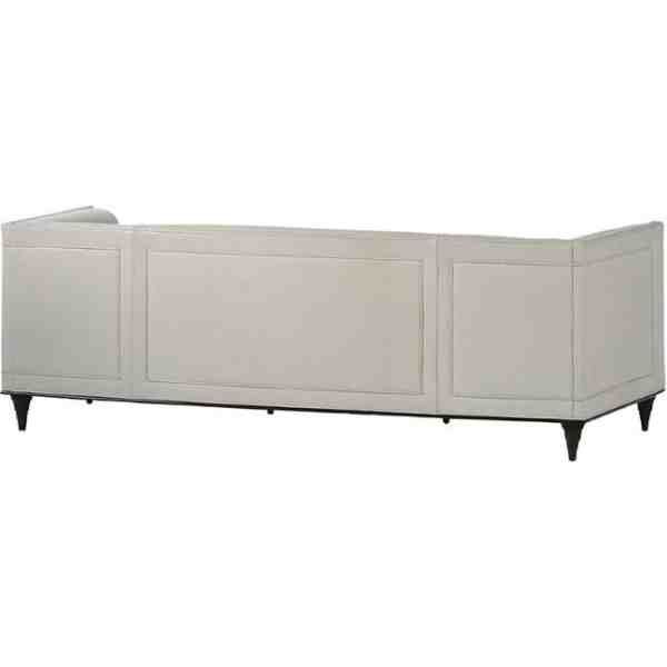 Tuxedo arm sofa with strong convergence. Tight back with decorative buttons. Loose seat. Welt – framed back and sides. Round tapered legs with brass ferrules. Named for Christopher Wren, the 17th and 18th century designer who rebuilt much of London after the fire, this chair is interior architecture – and a signature piece in the Bill Sofield Collection. Modern and meticulously detailed, it can either float or anchor a wall. Welt framing invites the use of contrasting fabric. Often specified in leather. Widely published.